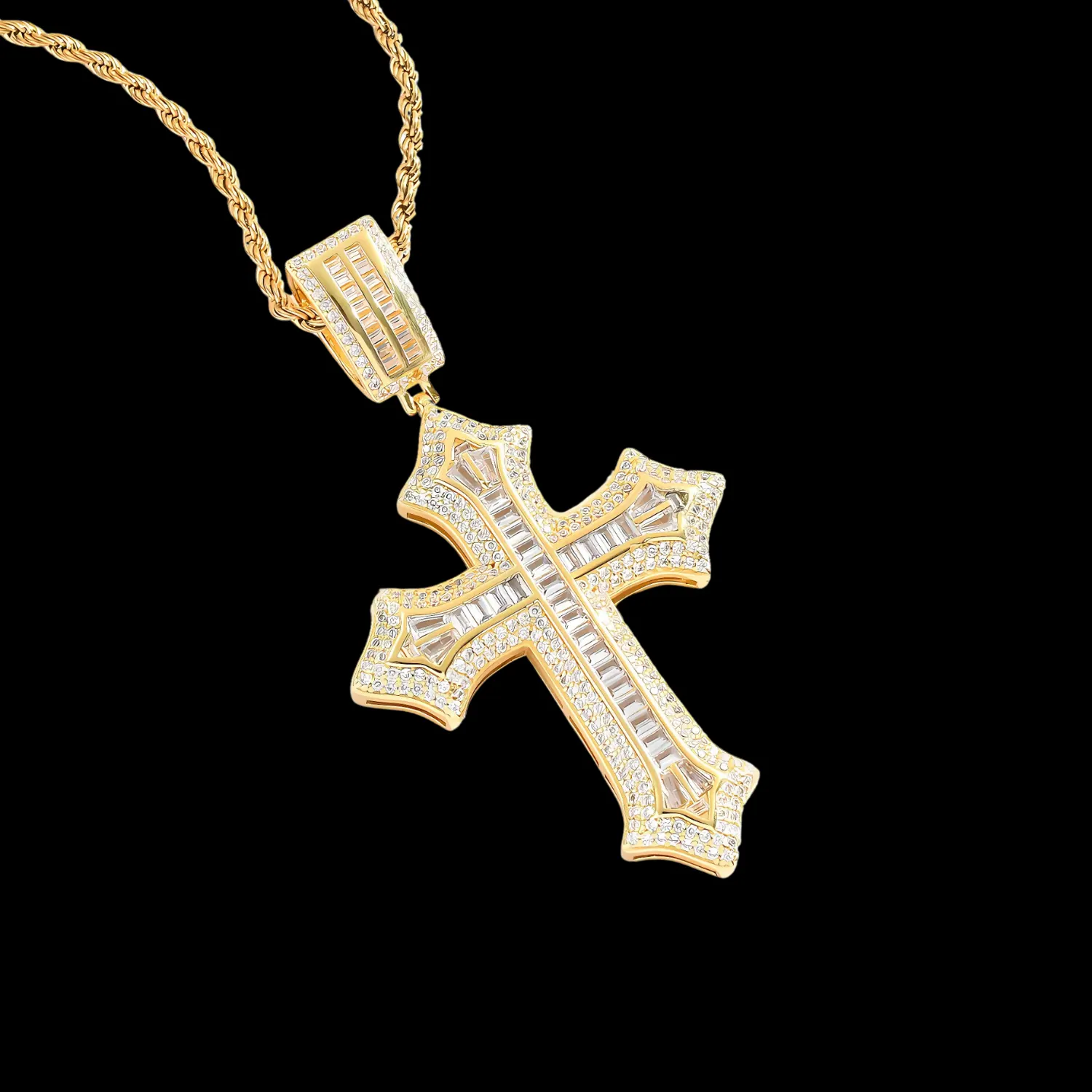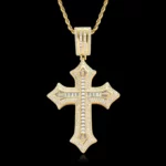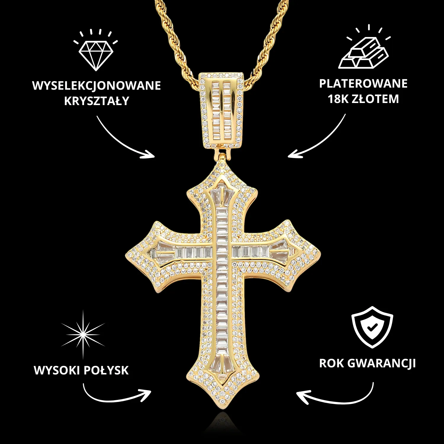 Duży złoty krzyż na szyję „Tupac cross” to krzyż stworzony na wzór naszyjnika 2Paca Shakura oraz tatuażu wytatuowanego na plecach artysty. Ten naszyjnik z krzyżem został stworzony z wysokiej jakości stali oraz poddany obróbce platerowania złotem próby 18k – 750. Środek zawieszki został ręcznie wysadzony błyszczącymi kamieniami w których zastosowaliśmy szlif bagietkowy. Aby dodać wyrazistego charakteru, na zewnętrznej stronie zawieszki osadziliśmy wiele mikro kamieni o szlifie „classic round cut”. Duży krzyż na szyję to propozycja dla każdego fana 2Paca oraz hip hopu!